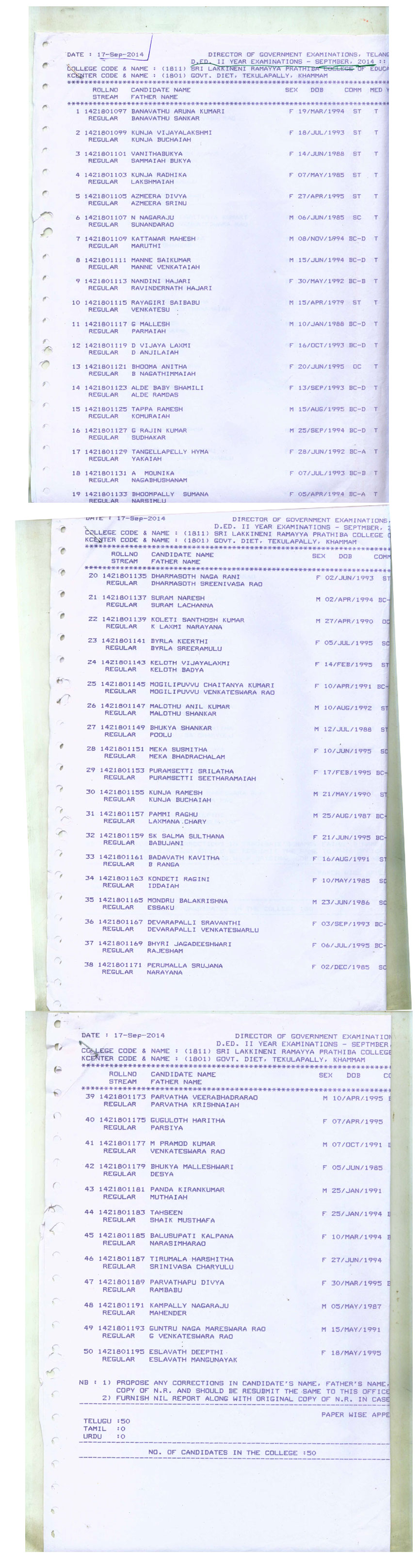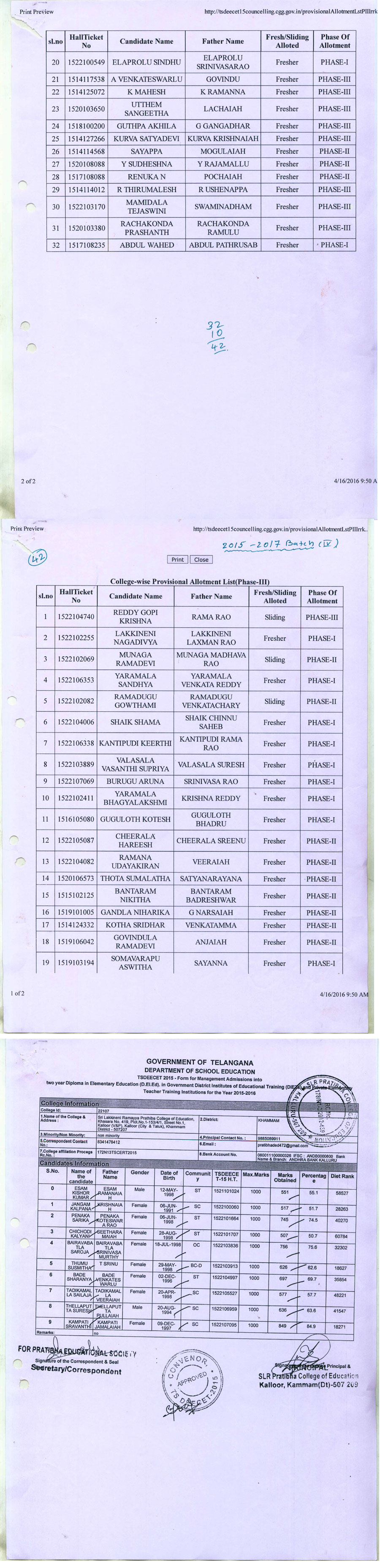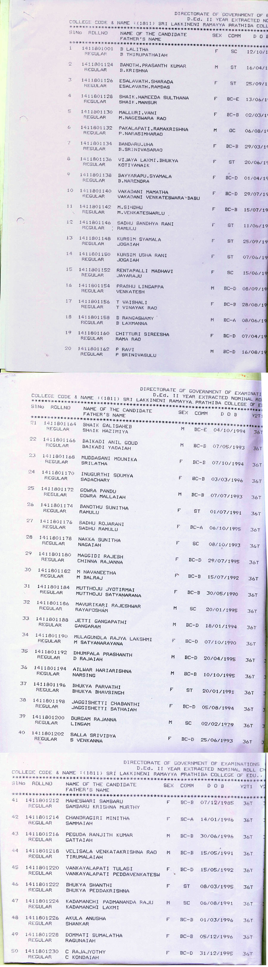 Consolidated list of candidates (Management Quoto-2024-25 Admission) in Sri lakkineni ramayya prathibha college of education ,Kalluru-507207,Khammam(dist) Download
